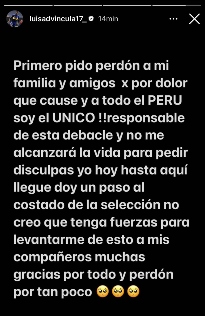 «Primero pido perdón a mi familia y amigos por el dolor que causé y a todo el Perú soy el único responsable de esta debacle y no me alcanzará la vida para pedir disculpas«, exhibió el defensor peruano.