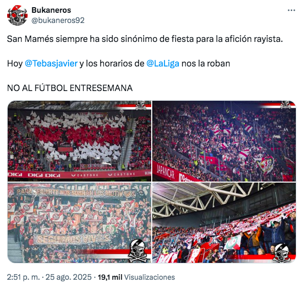 Alrededor de un centenar de aficionados del Rayo se desplazaron hasta La Catedral para ver el duelo de la segunda jornada de liga ante el Athletic Club de Bilbao. Un desplazamiento que no fue el habitual en los últimos años, ya que el horario no acompañó, lunes a las 19:30 horas. La peña Bukaneros protestó en sus redes sociales: