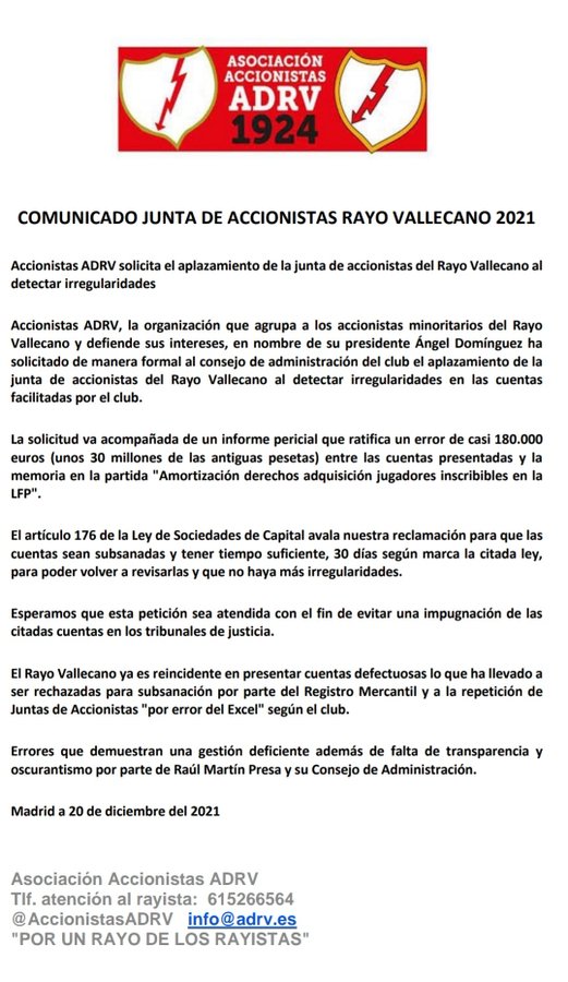 “El artículo 176 de la Ley de Sociedades de Capital avala nuestra reclamación para que las cuentas sean subsanadas y tener tiempo suficiente, 30 días según marca la citada ley, para poder volver a revisarlas y que no haya más irregularidades”. señalan. Accionistas ADRV realiza esta gestión “con el fin de evitar una impugnación de las citadas cuentas en los tribunales de justicia”.