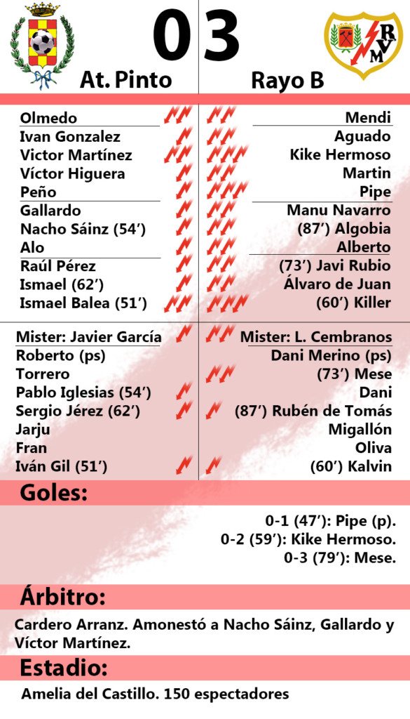 Victoria del Rayo B. El equipo de Luis Cembranos venció al Atlético Pinto (0-3) gracias a los goles de Pipe, Kike Hermoso y Mese. Pipe marcaba el primer tanto de penalti nada más comenzar la segunda mitad. Por su parte, el central Kike Hermoso anotaba el 0-2 de cabeza en el minuto 58. El encargado de poner el 0-3 en el marcador fue Mese a falta de diez minutos para el final del choque, en una contra bien montada por Álvaro Juan.