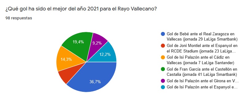 Al tanto de Bebé le siguieron el gol de Joni al Espanyol (19,4%) y el tanto de Isi Palazón (14,3%) esta temporada al Cádiz.