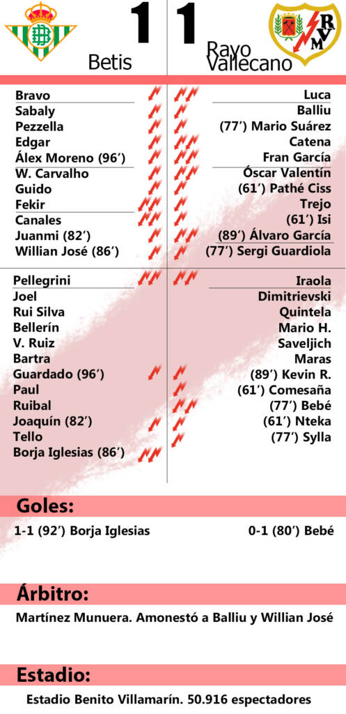 Pero la aguja de la pólvora seguía sin enhebrar. En el minuto 70, el Rayo seguía sin disparos a portería. Con mucho corazón y más personalidad, pero nada de olfato. Había que marcar y aún no se había probado a Bravo. Canales y William Carvalho, desde 25 metros, probaron fortuna sin encontrarla. También Fekir, que con los primeros síntomas de flato en Óscar Valentín y, por ende, en el Rayo, perdonó dentro del área: su zurdazo, centrado, acabó en los guantes de Luca. El all in supuso la entrada de Bebé y Sylla por Mario Suárez y Sergi Guardiola.