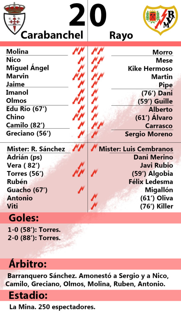 Un gol que hizo que el Rayo Vallecano B se volcará al ataque con la entrada de Oliva y Killer en busca del gol del empate. Pero lejos de la realidad, el Carabanchel demostraría una gran solidez defensiva y aprovecharía los huecos rayistas para colocar el segundo. Torres aumentaba su cuenta particular y cerraba un partido tras rematar una gran contra de Vera.