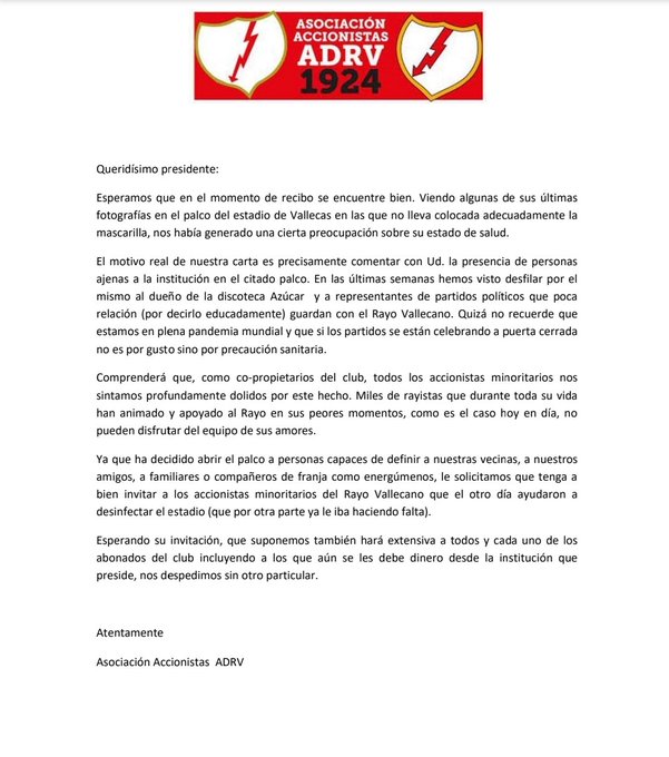 En el escrito, los accionistas minoritarios de la entidad muestran su preocupación por la presencia en el palco de personas ajenas al mundo deportivo en los últimos partidos del Rayo Vallecano. Además de recordar al mandatario rayista que los partidos son a puerta cerrada y en un momento de pandemia.