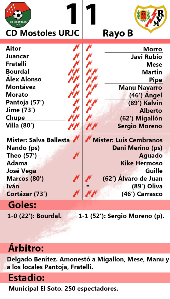 Empate (1-1) del Rayo Vallecano B en el Municipal de el Soto ante el CD Móstoles URJC gracias a un gol de Sergio Moreno de penalti. Partido correspondiente a la vigésimo séptima jornada del grupo VII de Tercera División.