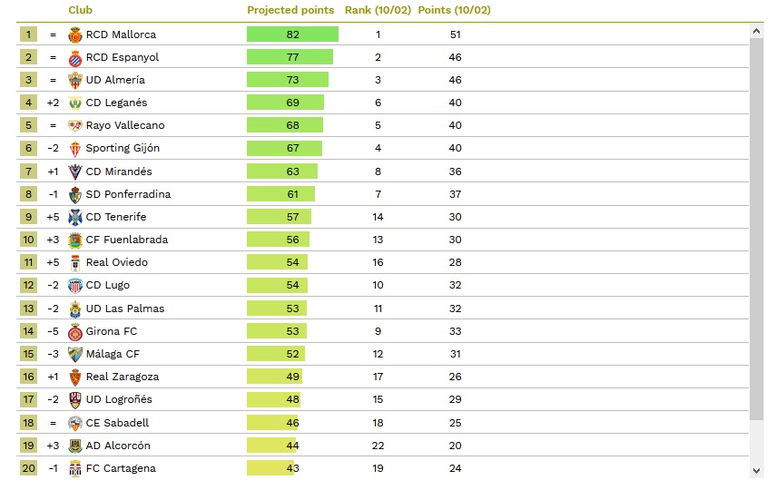 Según este estudio, el club franjirrojo disputará los playoffs a final de temporada al finalizar en un hipotético quinto lugar en la clasificación de Segunda.