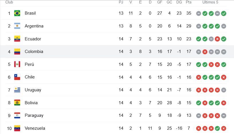Un hecho que le está llevando a Colombia a una situación complicada. Ahora mismo ocupan el 4º lugar, la última plaza directa para el Mundial de Qtar (el 5º va al repechaje). Pero Perú (con los mismos puntos), Chile, Uruguay o Bolivia (los tres a menos de una victoria) acechan al equipo colombiano. A falta de cuatro partidos todo puede pasar. Aunque si Colombia quiere ir al Mundial deberá recuperar el gol.