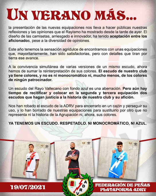 “Un escudo del Rayo Vallecano con fondo azul es una aberración. Pero aún hay tiempo de rectificar y colocar en la segunda y tercera equipación dos escudos que hagan justifica a la historia de nuestro club y afición”.