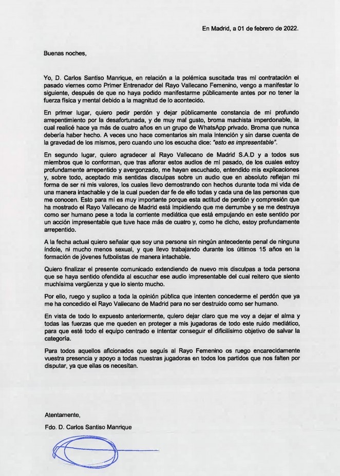El entrenador del Rayo Vallecano Femenino Carlos Santiso se ha pronunciado por primera vez tras la polémica surgida en los últimos días tras su llegada a la entidad franjirroja.