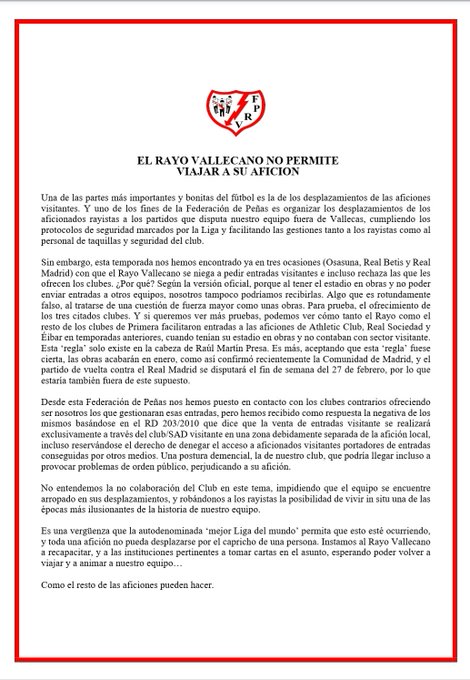 Por otro lado, pide a las instituciones, entre ellas LaLiga, que tome cartas en el asunto y ayuden a solventar una situación que está dejando a muchos aficionados del Rayo sin poder ir a los estadios visitantes.