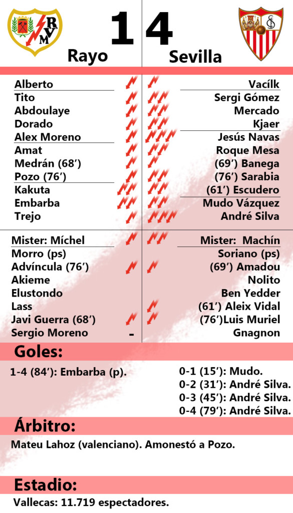 Dura. La temporada va a ser dura. Nadie lo negaba antes del debut y nadie se atreve a negarlo ahora. Si se quiere estar entre los mejores hay que rendir como los mejores. Y al Rayo Vallecano le falta todavía mucho, aunque esto no ha hecho nada más que empezar. Los de Míchel cayeron goleados frente al Sevilla en casa (1-4) tras una primera parte donde los hispalenses fueron muy efectivos y vieron puerta con mucha facilidad. El Mudo Vázquez y André Silva con un triplete pusieron los goles visitantes y Adrián Embarba el local de penalti.