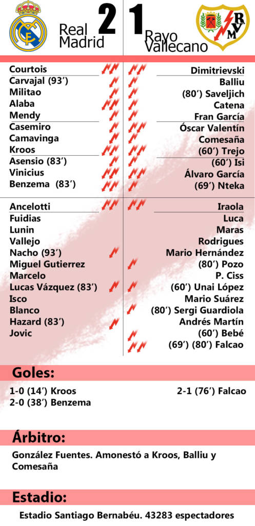 Con ese panorama el 1-0 era cuestión de tiempo, y llegó caricaturizando a la defensa franjiblanca. Pase larguísimo hacia Vinicius, que echó a correr en fuera de juego… Roto por Fran García que, inexplicablemente, quedó descolgado a 50 metros. Asensio acabó sirviendo un centro raso que Kroos fusiló de primeras. El segundo llegó por medio de Benzema, pícaro para aprovechar un desconcierto Catena-Dimi y rematar a placer un excepcional envío de Alaba. Sólo Trejo, que no se altera ni en un incendio, transmitió templanza. Los detalles del Chocota (200 partidos con la Franja) fueron un oasis entre el cataclismo de la primera parte. Si no el peor, estaba siendo uno de los peores Rayos de la temporada.