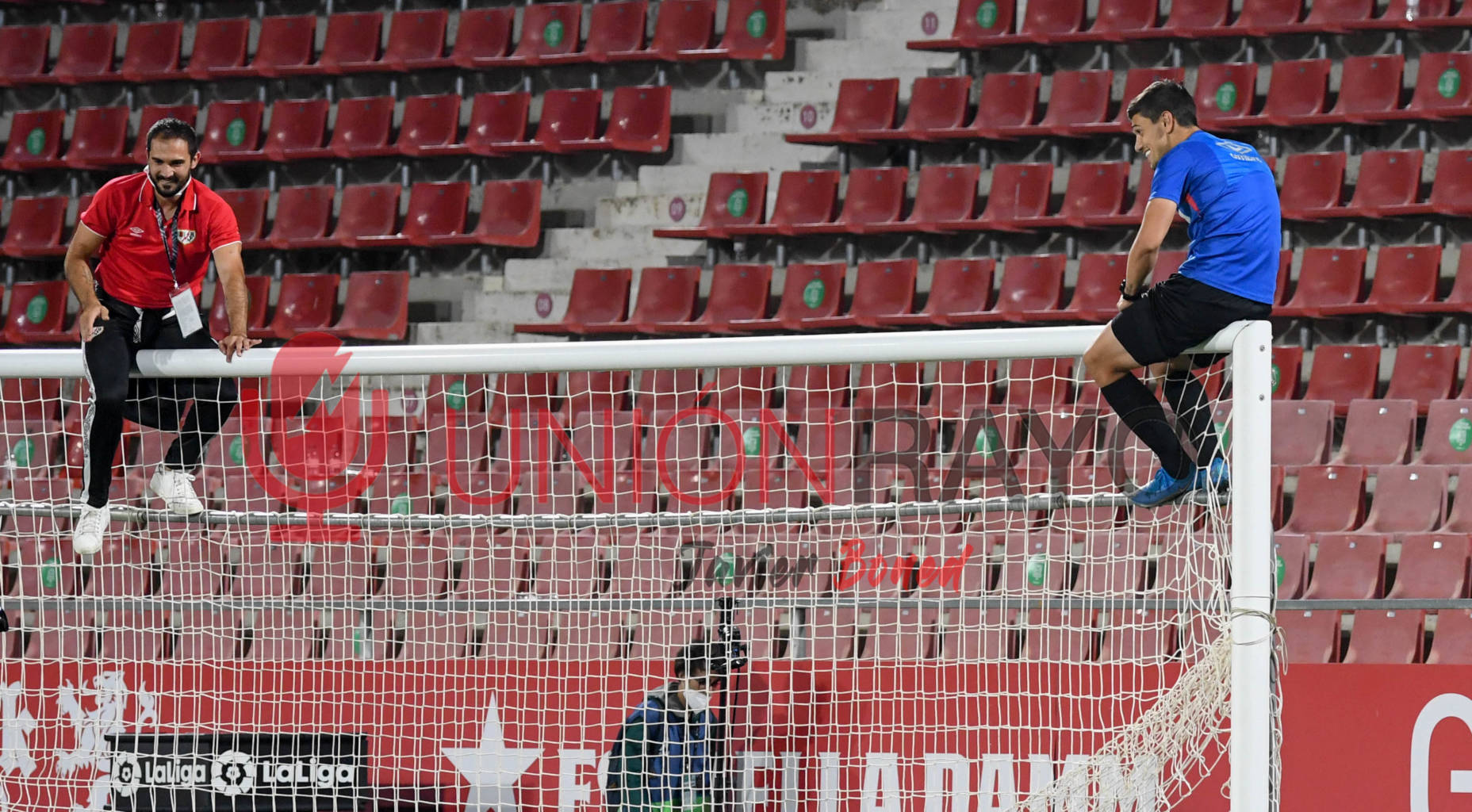 Iván Martos y Andrés Martín se llevaron las redes de una de las porterías del estadio de Montilivi.