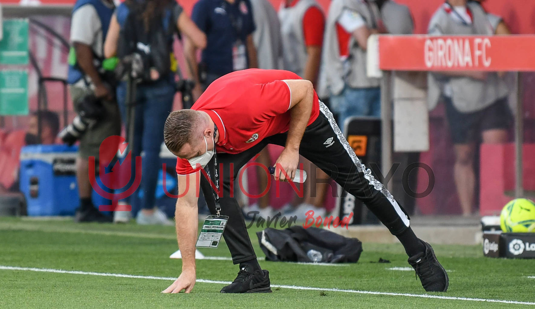 Alberto García sabía que se despedía como jugador en Montilivi. El ex guardameta sabía que se iba a retirar e intento disfrutar de cada segundo a pesar que no estaba sobre el césped. Antes de irse a la grada tocó el césped en busca de la buena suerte.