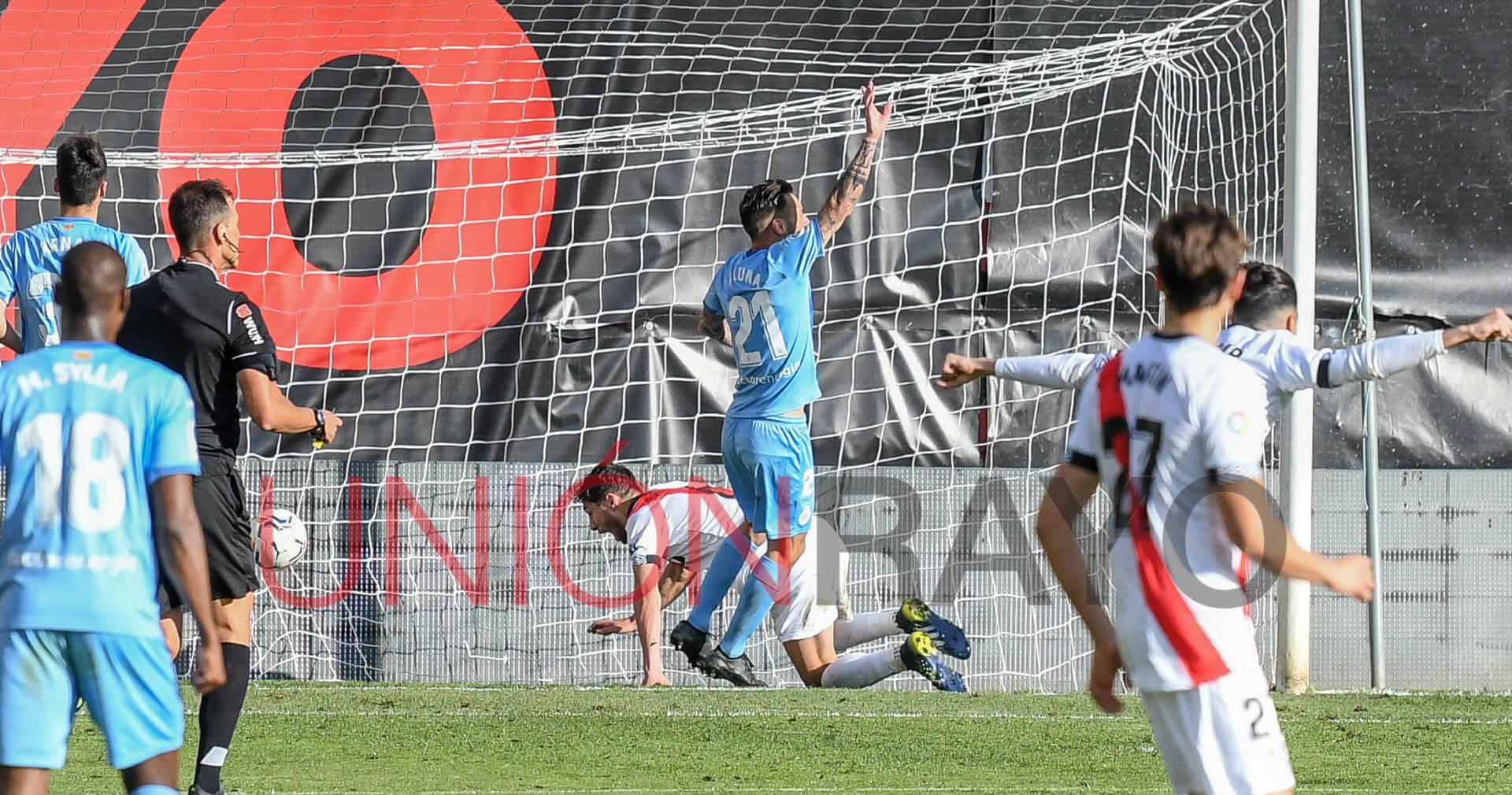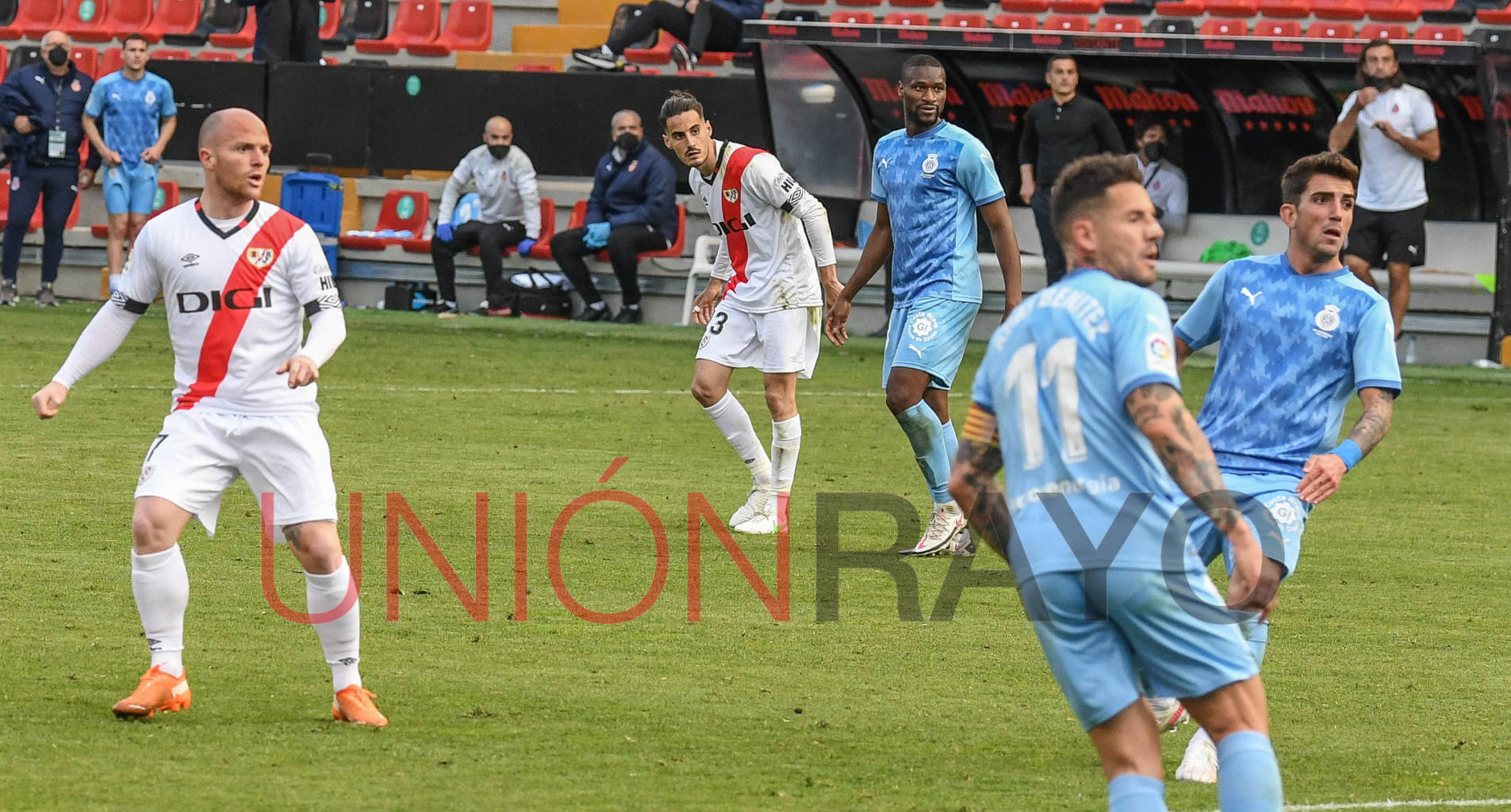 Un gol a balón parado adelantaría al Girona tras Santi Bueno adelantarse a la defensa franjirroja. La cara de los futbolista del Rayo lo decían todo...