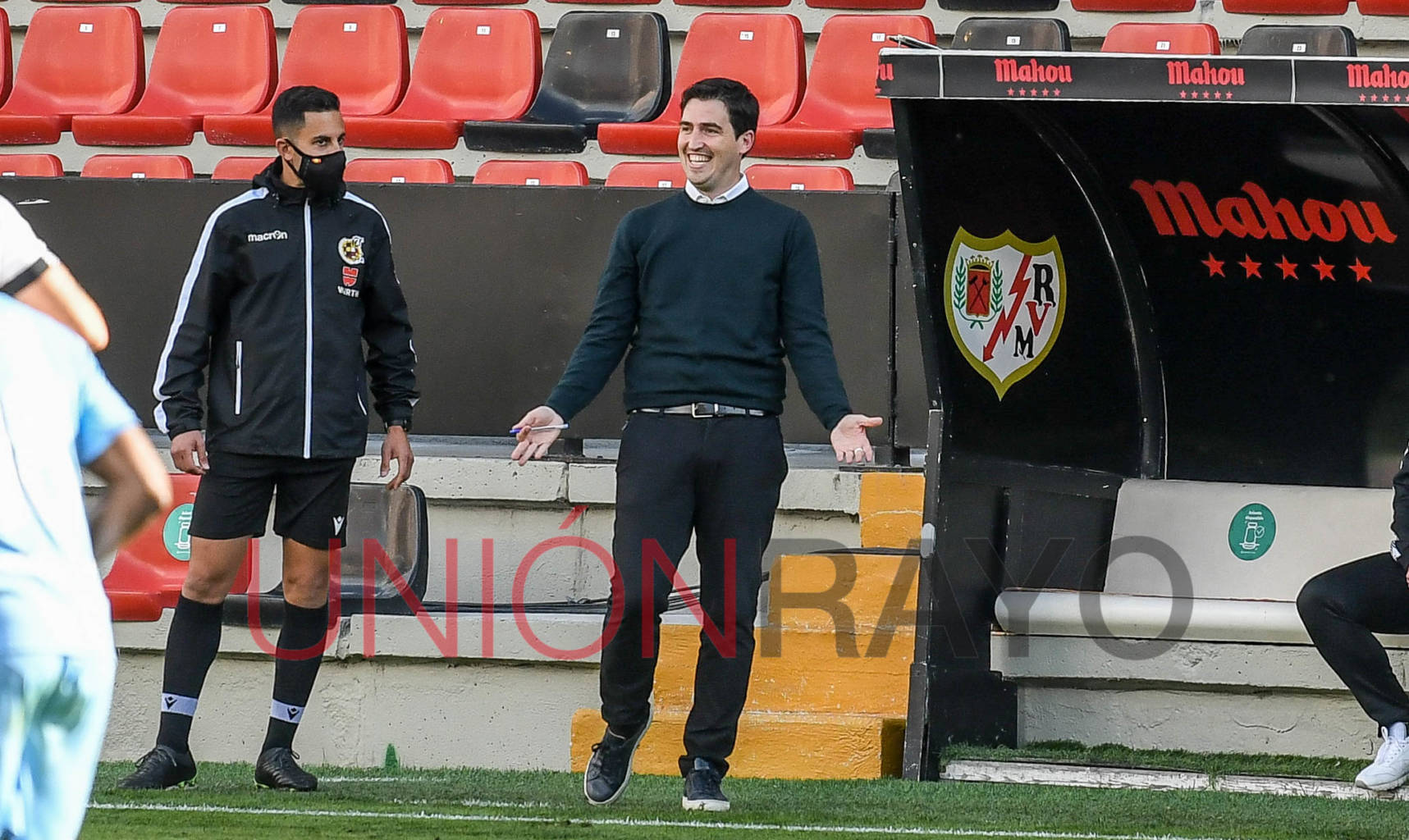 El colegiado del partido desesperó a unos y otros. El cuarto árbitro tuvo que ir al banquillo del Rayo en el comienzo del partido tras protestas locales. Iraola solo podía reir…