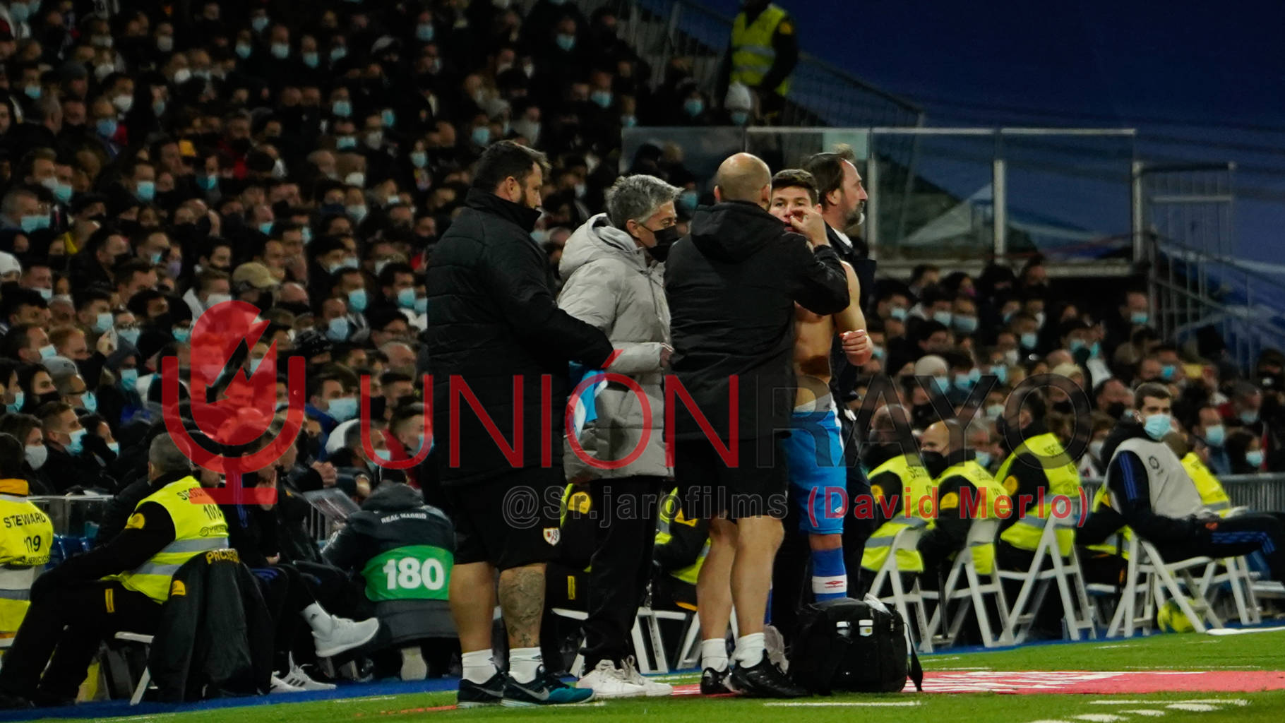 Fran García tuvo que ser atendido en la banda del Bernabéu. Se cambió la camiseta al sangrar por la nariz.