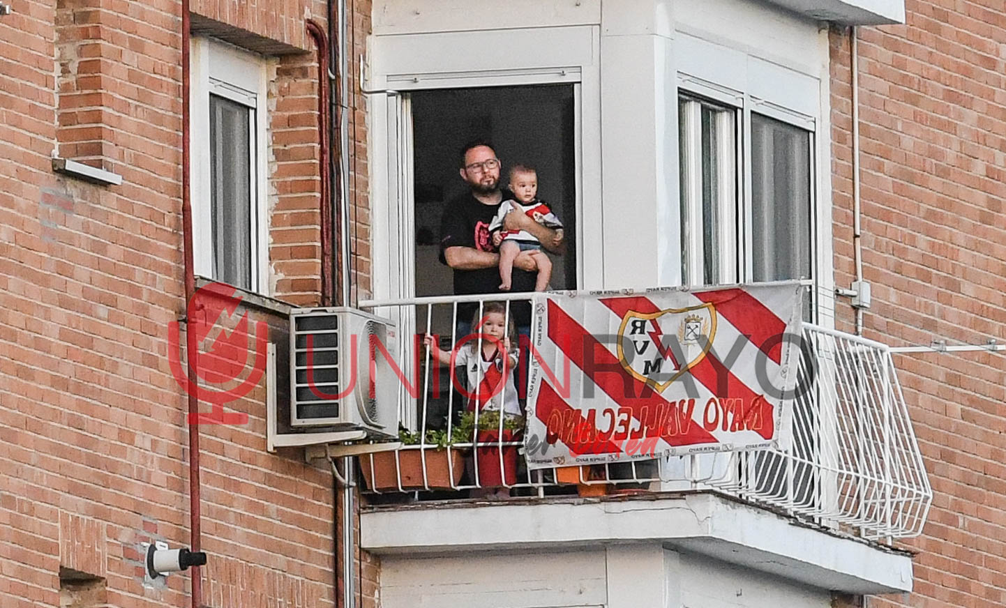 Rayismo desde la cuna. El vecino rayista José Luis apoyó al Rayo con sus hijos desde uno de los balcones VIP.