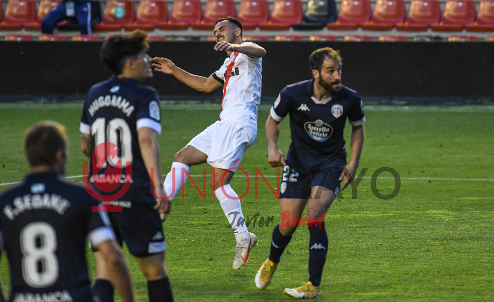 Penalti en contra para el Lugo. No se lo creían los jugadores del Rayo que tenían el partido controlado.