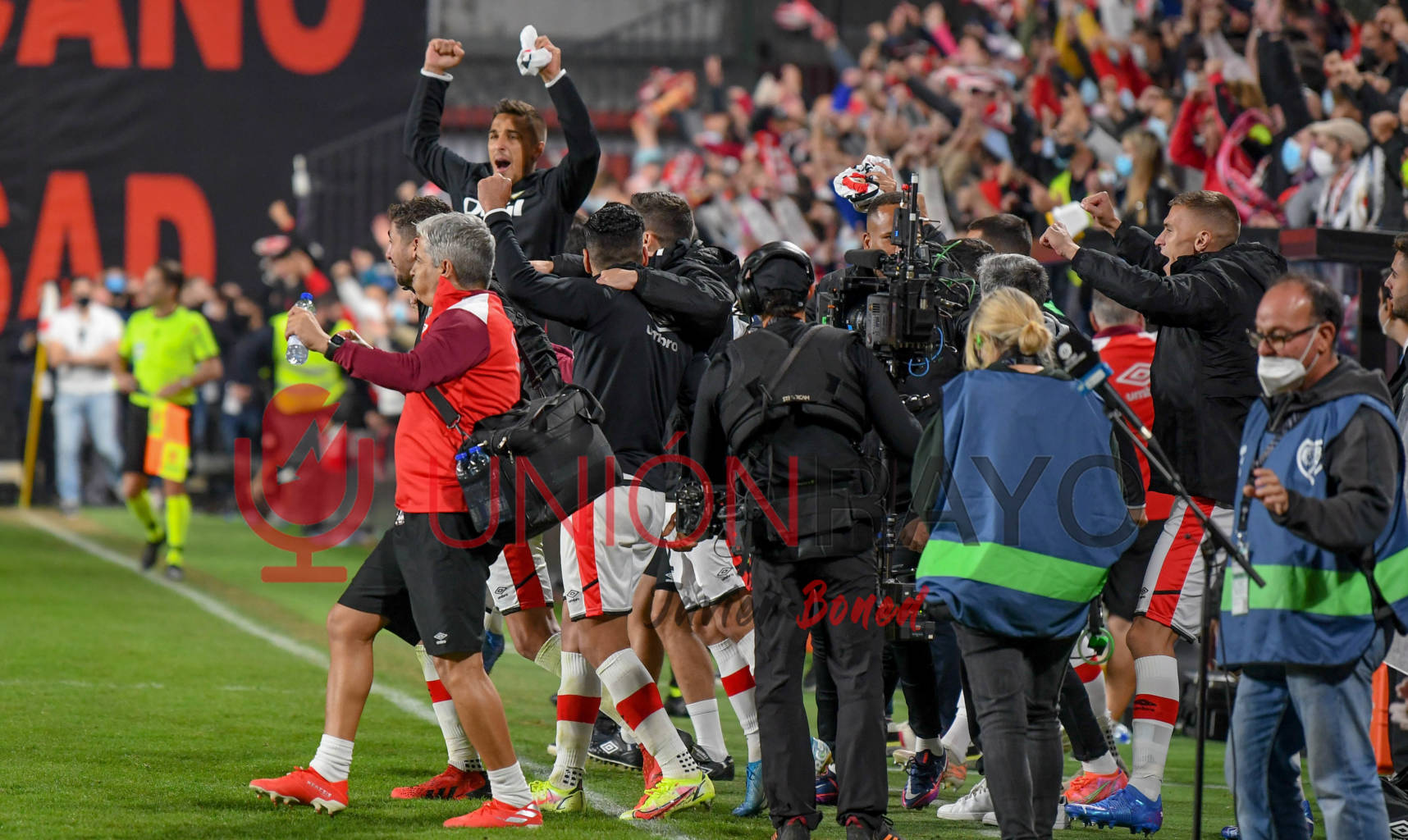 Momento de festejar. La plantilla rayista celebró junto a la afición el triunfo ante los azulgrana. La Vida Pirata volvió a sonar.