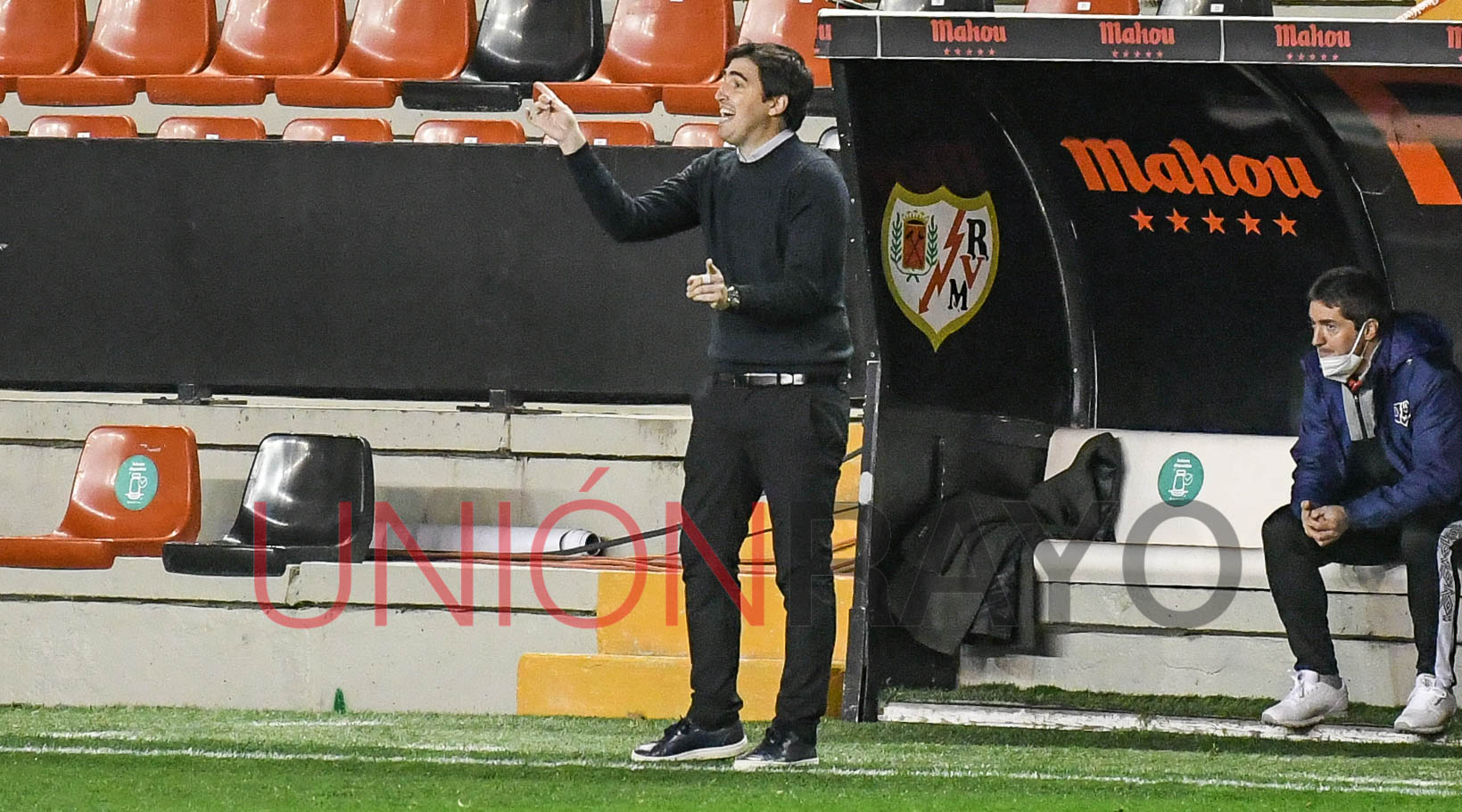 La ‘táctica’ del cuerpo técnico del Rayo a balón parado. Cada vez que hay una falta en contra se produce una curiosa imagen. El técnico Andoni Iraola se sienta en una esquina del banquillo y su segundo, Unai Mendía, se levanta y da las instrucciones.