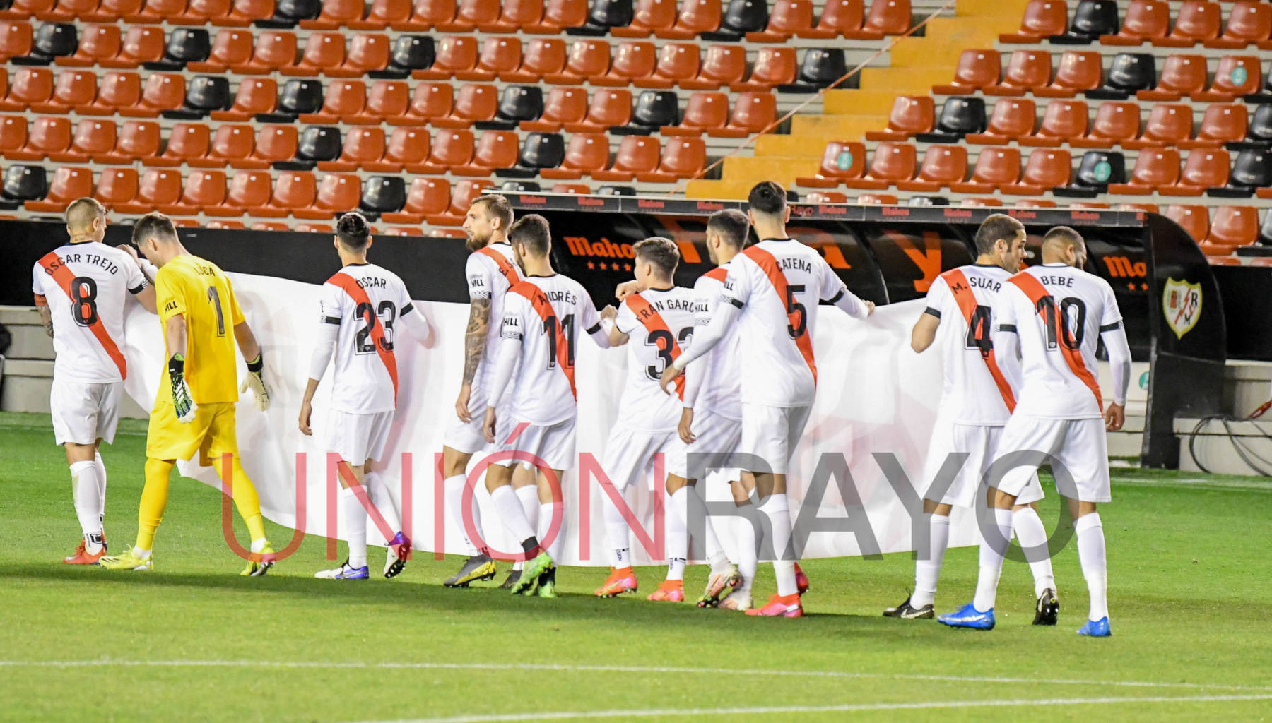 Los futbolistas del Rayo Vallecano saltaron al campo con una pancarta en apoyo a un aficionado del equipo franjirrojo que se encuentra luchando contra una enfermedad.