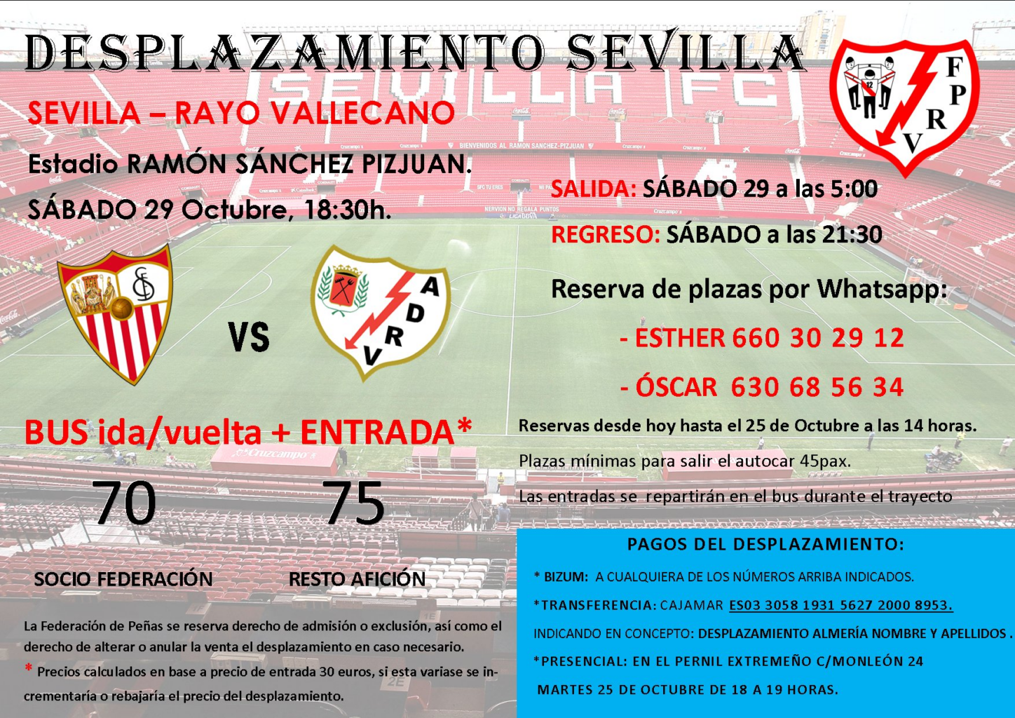 La Federación de Peñas del Rayo Vallecano ha organizado un viaje a Sevilla para el partido ante el Sevilla CF, correspondiente a la décimo segunda jornada de LaLiga Santander, tras el exitoso viaje ante el CA Osasuna o Athletic Club de Bilbao, entre otros.