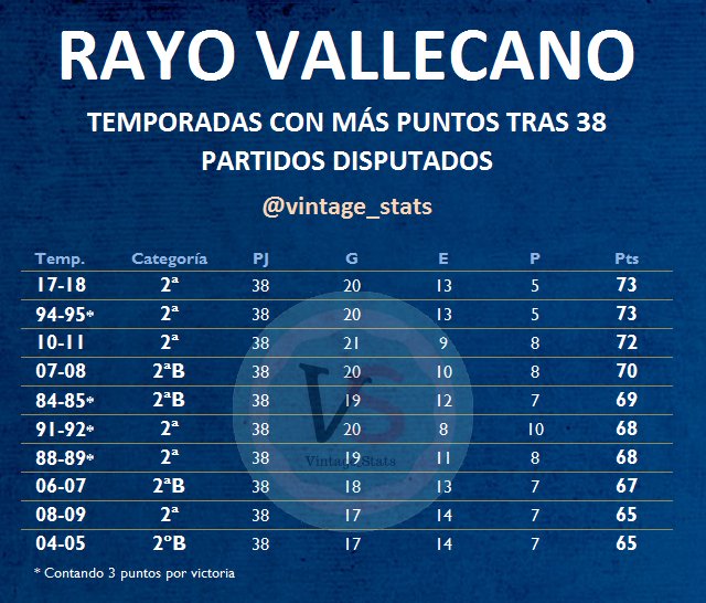 Además, el Rayo Vallecano 2017-2018 ya ha hecho historia al ser el segundo equipo rayista que llega a los 73 puntos en la jornada 38 (anteriormente los campeoantos de Liga duraban 38 jornadas). Como bien refleja @vintage_stats en Twitter, el Rayo de Paquito (temporada 1994-95) finalizó su Liga con los mismos datos que el Rayo actual: 20 victorias, 13 empates y 5 derrotas.