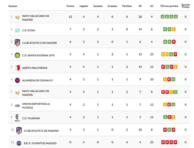 El equipo ocupa en estos momentos la primera posición con cuatro partidos ganados de cuatro disputados. Los de Gonzalo Villa han anotado 38 goles y solo han recibido cuatro tantos (equipo que más marca y menos encaja). Este próximo sábado visita Alameda de Osuna. (consulta horarios de la cantera).