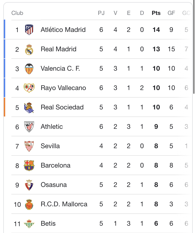El conjunto vallecano se sitúa en cuarta posición con diez puntos en la tabla a falta de disputarse la mayoría de los duelos de la jornada 6.