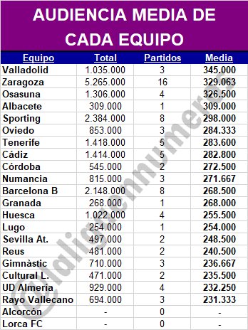 Muy por encima quedan los equipos que más audiencia (media) tienen en este tramo de campeonato. El Valladolid (345.000 espectadores), Zaragoza (329.063 espectadores) y Osasuna (326.500 espectadores) son los tres equipos más vistos.