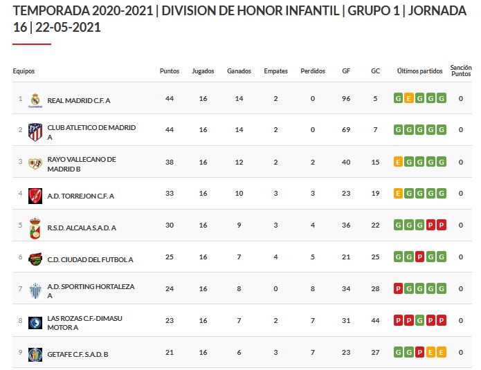 El Infantil A está encuadrado en el Grupo I donde se encuentra en la parte alta de la clasificación. Los franjirrojos siguen la estela de los líderes: Real Madrid A y Atlético de Madrid A (ambos también de segundo año). Los de Moya son el tercer equipo más goleador y el tercer equipo menos goleado; y lograron un meritorio empate ante los rojiblancos (2-2) en Vallecas. A falta de una jornada, se puede decir que han realizado una sobresaliente temporada.