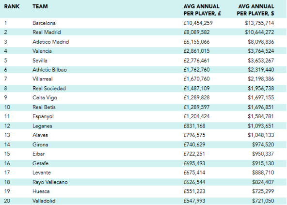 Asimismo, el Barcelona es el equipo con el sueldo más alto de La Liga, con 11,8 millones de euros de media, seguido del Real Madrid, con 9,13 millones.