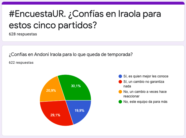 Por otro lado, un 50% no confía en Iraola para estos últimos partidos. Un 30,1% cree que el equipo puede dar más rendimiento que el que le está sacando el ex del Mirandés mientras que un 20,9% piensa que a veces un cambio de entrenador hace reaccionar al equipo.