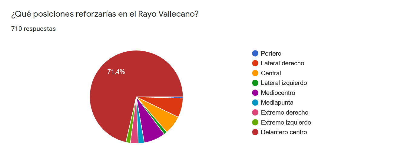 Los de Iraola afrontan el difícil reto de mantenerse en Primera División, para ello, el equipo necesita reforzarse en determinadas posiciones. La más clara, en el puesto de delantero centro, donde el año pasado entre Guerrero, Ulloa y Qasmi apenas marcaron 5 goles. El 71,4% de la afición rayista, 507 personas, ficharía un delantero centro. La segunda posición más votada es la del mediocentro. El 7,5%, 53 personas, ficharía un jugador para el mediocampo.