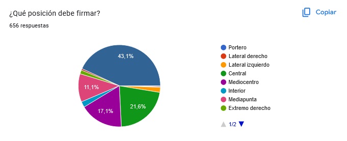 En cuanto a las prioridades de los puestos a reforzar, el 43% de los encuestados piensan que la prioridad es un delantero mientras que un 21,6% creen que se debe firmar un central y un 17% un mediocentro.