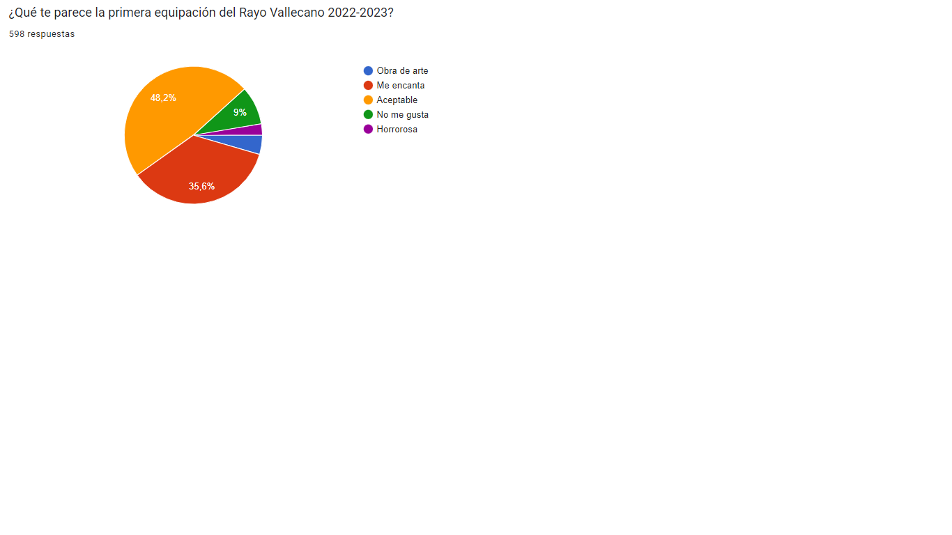 Centrándonos unicamente en la primera equipación, con más de quinientas noventa y ocho respuestas, cuatro de cada diez (un 48,2%) la ven aceptable y al (35,6%) les encanta, aunque otra parte de la afición, el (9%) no les gusta , mientras que un (4,5%) de la afición la ven como una obra de arte y un (2,7%) horrorosa.
