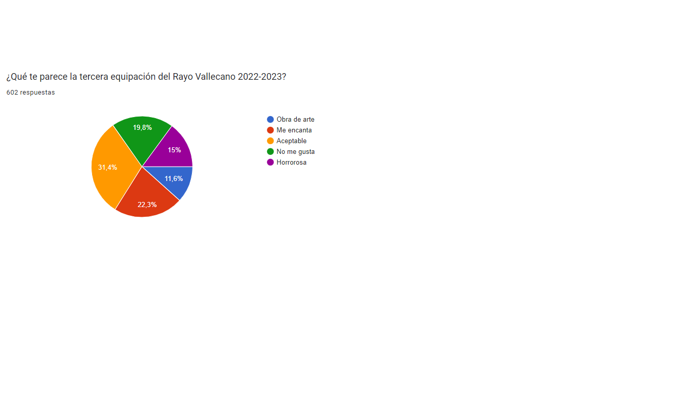 Centrándonos unicamente en la tercera equipación, con más de seiscientas respuestas, dos de cada diez (un 22,3%) les encanta y al (31,4%) la ven aceptable, aunque otra parte de la afición, el (19,8%) no les gusta , mientras que un (11,6%) de la afición la ven como una obra de arte y un (15%) horrorosa. Sin lugar a dudas, la camiseta que más debate ha generado.