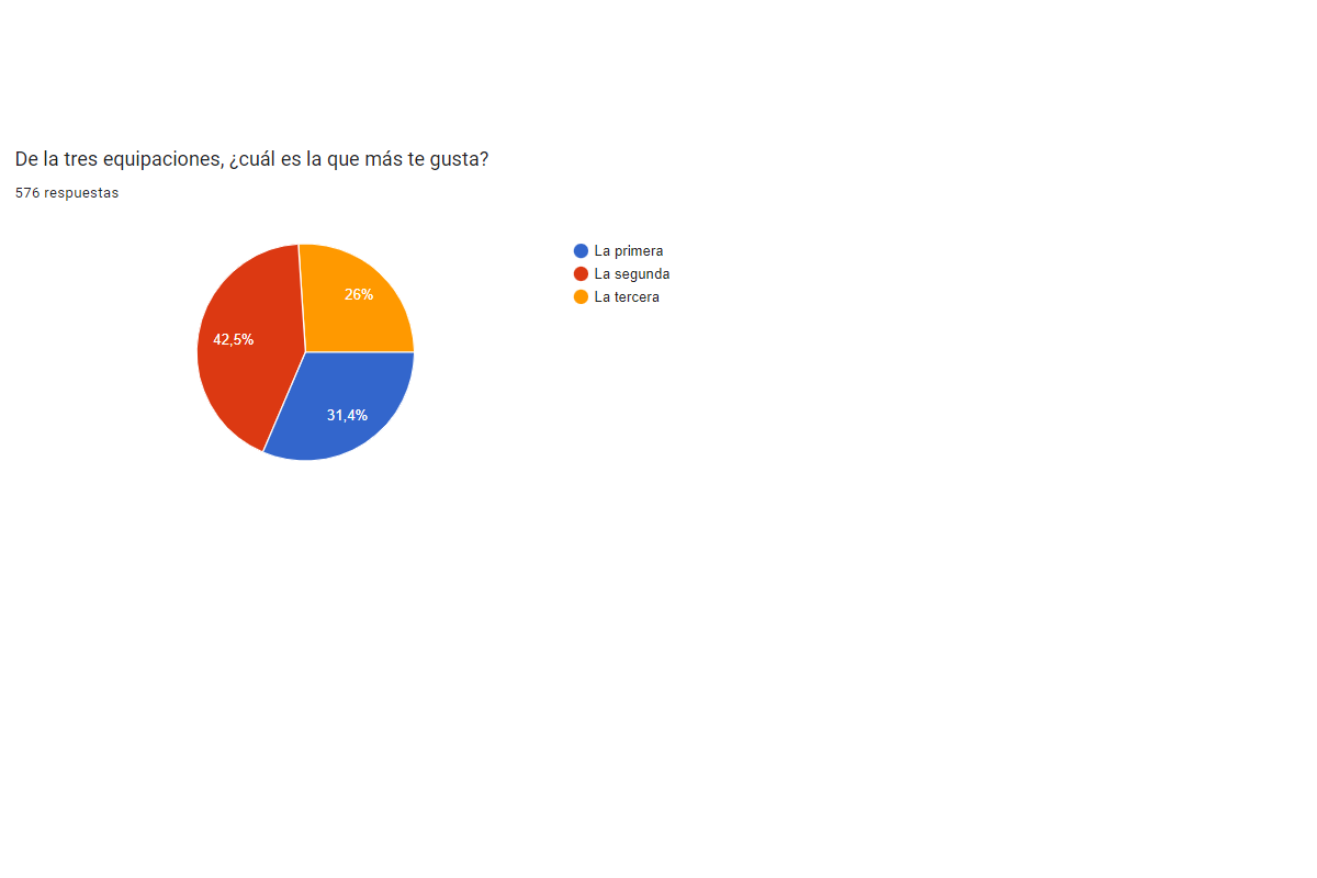 Con más de quinientas setenta respuestas, tres de cada diez (un 31,4%) creen que la equipación más bonita es la primera, aunque otra parte de la afición, (el 42,5%) se decanta por la segunda equipación, mientras que un (26%) de la afición prefiere la innovación de la tercera.