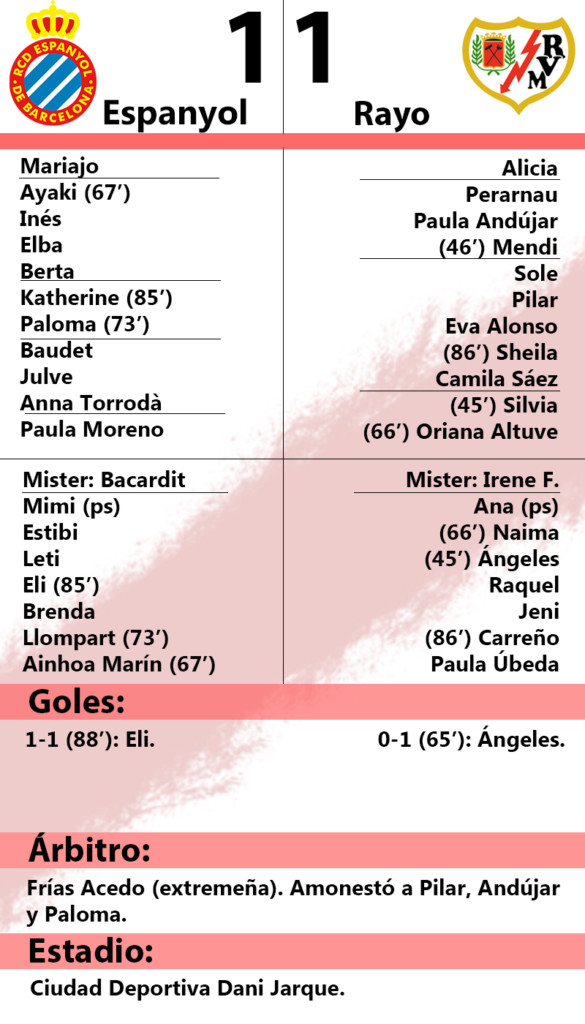 5 minutos faltaron para que el Rayo Vallecano se llevara la victoria de la Ciudad Deportiva Dani Jarque ante el Espanyol. Ángeles adelantó al equipo madrileño en el 65 y cuando parecía que los tres puntos viajarían hacia la capital, el tanto de Eli puso finalmente las tablas en el marcador. A pesar de ello y de ser el tercer empate consecutivo, las sensaciones en este final de año 2018 son muy buenas. Las chicas de Irene Ferreras lo despiden tras un mes de diciembre invicto y afianzándose sextas en la parte alta de la clasificación.