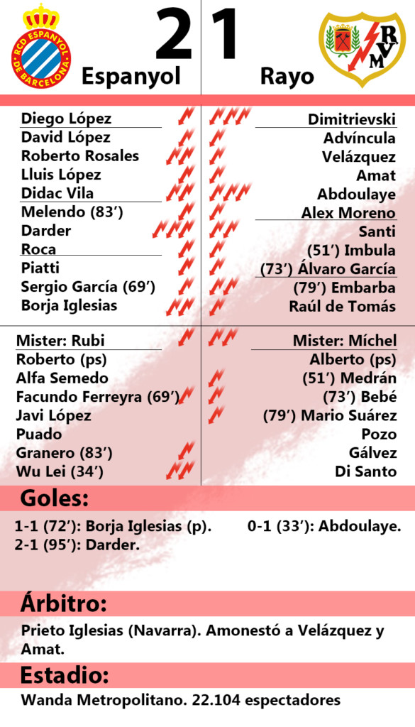 Estuvo muy cerca… pero también muy lejos. El Rayo Vallecano tuvo la victoria en su mano tras ir ganando durante gran parte del encuentro frente al Espanyol con un tanto de Abdoulaye Ba. Sin embargo, Borja Iglesias empató desde el punto de penalti tras una gran jugada de un Wu Lei desatado. En las postrimerías del partido, el VAR anuló un tanto de Sergi Darder por fuera de juego. Y cuando el empate parecía inevitable, el propio Darder firmó una volea de oro para dejar los tres puntos en casa.