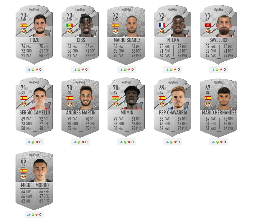 La carta de más valor es la de Raúl de Tomás con 83 de media. Este fue el último fichaje del Rayo Vallecano, oficializado recientemente, fichado por la entidad franjirroja por 8 millones + 3 en variables. Esta incorporación ha tenido una gran acogida entre la afición rayista.