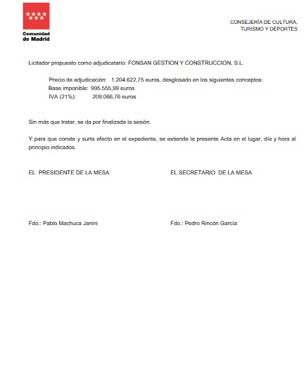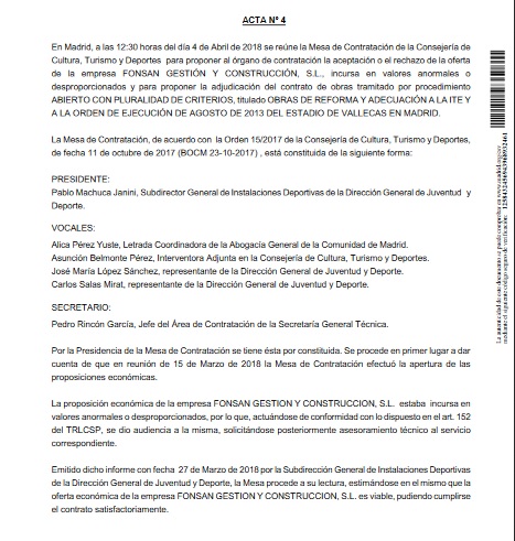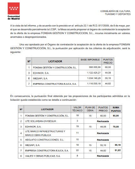 Según cita el acta de la Mesa recogida por Matagigantes.NET, la proposición económica de la empresa FONSAN “estaba incursa en valores anormales o desproporcionados” debido a que la oferta de la licitación era de 1.204.622,75€, más de 500.000€ menos que el valor estimado de contrato que hizo la Comunidad de Madrid (1.783.264,94€).