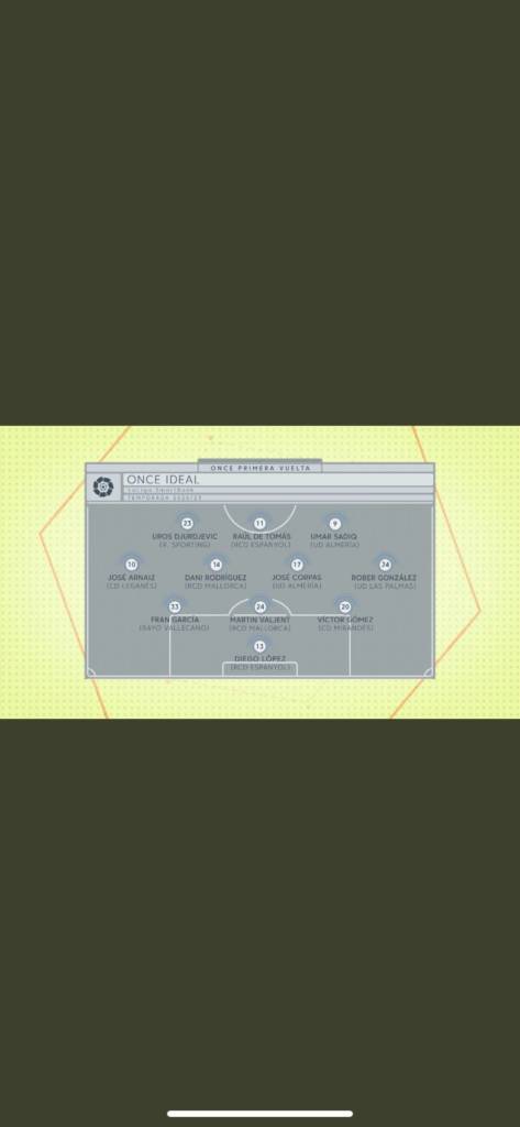 Diego López, Martin Valjent, Víctor Gómez, José Arnaiz, Dani Rodríguez, José Corpas, Rober González, Umar Sadiq, Uros Djurdjevic y Raúl de Tomas, son el resto de jugadores que conforman el once ideal.