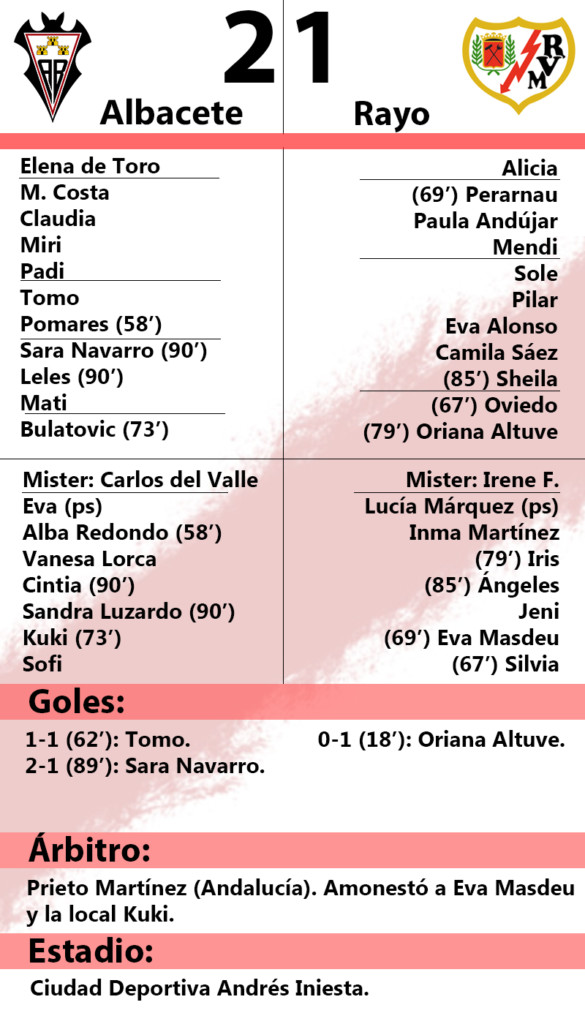 En la segunda mitad el Fundación Albacete fue superior y dio la vuelta al marcador tras la entrada de Alba Redondo. La japonesa Tomo aprovechó una buena jugada de la jugadora internacional para colocar el 1-1 en el marcador. Ferreras movió el banquillo e intentó buscar una reacción en el equipo rayista para evitar el empuje local. Los minutos pasaban y parecía que un punto podía viajar hasta Vallecas. Pero Sara Navarro en los últimos minutos culminó la remontada local tras finalizar un contragolpe. Un duro golpe para las franjirrojas tras todo el esfuerzo desplegado sobre el césped.