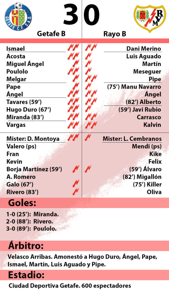 A falta de cinco minutos para el final, el Getafe B colocaba el segundo del encuentro tras un centro desde la izquierda que Rivero, ex rayista, se encargaba de colocar dentro de la red. Sin tiempo para responder, y con el conjunto vallecano volcado, Poulolo situaba el tercero en el marcador con un gran remate cruzado.