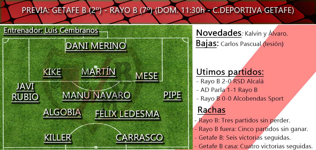 Tras acabar la temporada con un empate sin goles ante el Alcobendas Sport, el Rayo Vallecano B acumula tres encuentros sin conocer la derrota, pero con dos empates en las últimas jornadas. El equipo dirigido por Luis Cembranos se sitúa en séptima posición con 27 puntos, a cinco de los puestos de play-off de ascenso y a doce de su rival.
