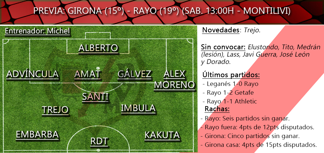 Nueva prueba de fuego para el Rayo Vallecano apenas tres días después del desgaste del partido en Vallecas contra el Athletic de Bilbao. Míchel está en el foco de la atención y una derrota en Montilivi podría hacerle salir del banquillo franjirrojo. El técnico cuenta con el apoyo de la grada y del vestuario.