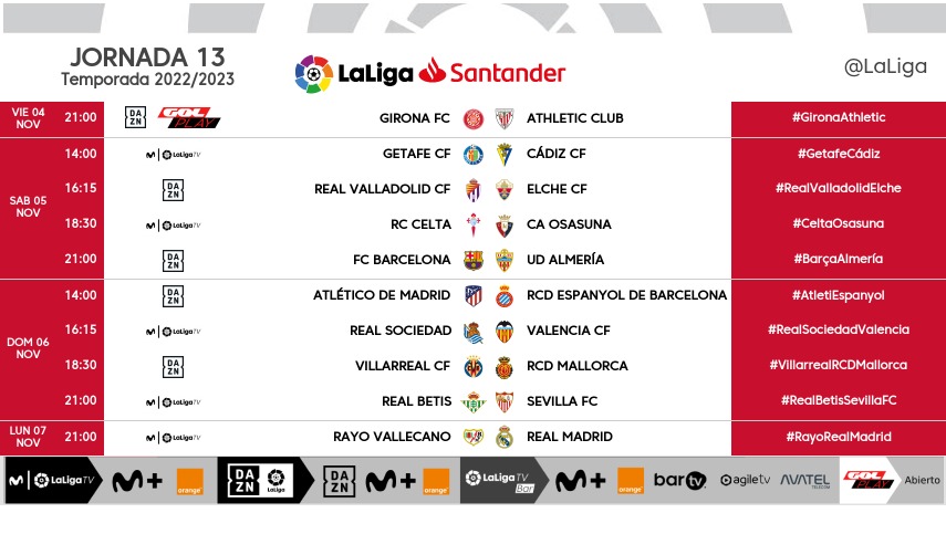 La Liga ha dado a conocer el horario correspondiente a la jornada 13 de LaLiga Santander en Primera División. De este modo, el Rayo Vallecano se medirá al Real Madrid en El Estadio de Vallecas el próximo lunes 7 de noviembre a las 21:00.