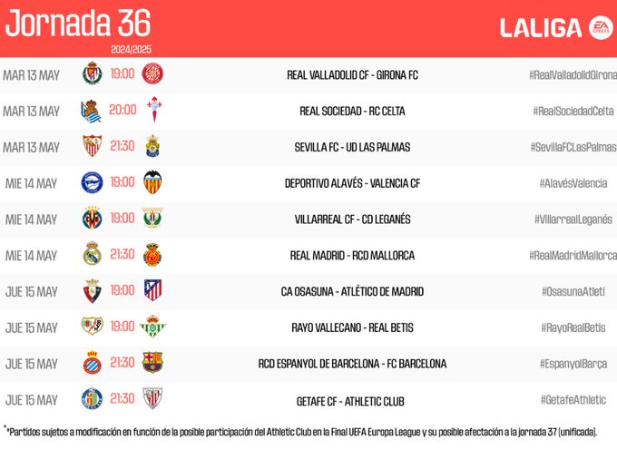 LaLiga ha dado a conocer los horarios correspondientes a la jornada 36 de LaLiga EA SPORTS.